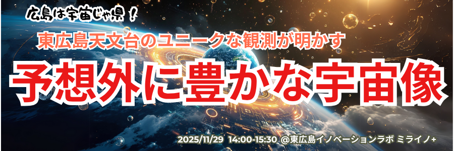 本講演では、東広島天文台の特殊な観測技術が切り拓く、宇宙の新たな姿をご紹介します。見えないものを「見る」天文学の世界へ、ぜひお越しください。